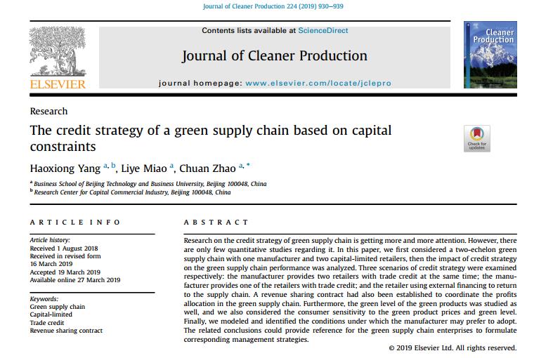 Recently, as the first author, Professor Yang Haoxiong, Deputy Dean of the Business School, published the academic paper The Credit Strategy of a Green Supply Chain Based on Capital Constraints in the Journal of Cleaner Production, an authoritative journal published by Elsevier with the Impact Factor of 5.651.