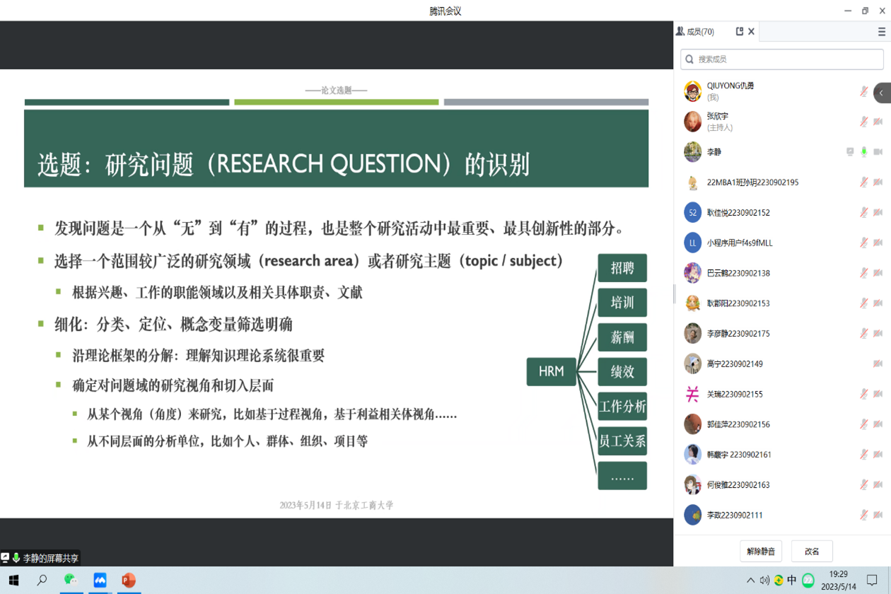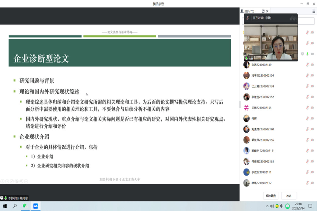 On May 14, 2023, at 19:00, the MBA Education Center of the Business School held a seminar on "MBA Thesis Topic Selection and Writing Standards." Ms. Li Jing, Deputy Director of the School of Economics and Business Administration and the MBA Education Center at Beijing Normal University, was invited to provide guidance and answers for the students. The seminar was hosted by Deputy Director Qiu Yong of the Department of Business Administration, and it was attended by Mr. He Hui, Executive Director of the MBA Center at the Business School, and more than 70 MBA graduate students.