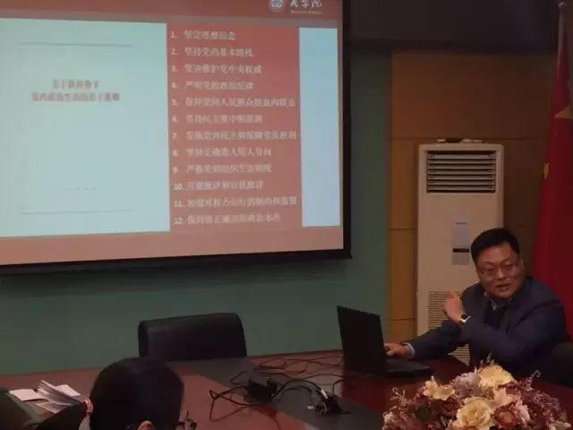 党委副书记樊江涛对研究生党支委进行了《关于新形势下党内政治生活的若干准则》和《中国共产党党内监督条例》的解读。结合十八届六中全会,樊江涛副书记对《准则》和《条例》进行了详细的讲解,并勉励研究生党员要深刻领会“四个自信”,从根本上把握中国特色社会主义的文化本质;要树立政治意识、大局意识、核心意识和看齐意识,保持清醒的头脑,坚定政治方向,增强政治敏感性和政治鉴别力,主动向优秀共产党员看齐,向党的路线和方针政策靠拢,坚决抵制党员队伍中的“虎”和“蝇”。随后,樊江涛副书记详细解读了十八届六中全会提出的“六个”不准和“八个”不允许,并以生动的例子加强党员的理解。他鼓励新党员要切实发挥模范带头作用,帮助身边学习上、生活上有困难的同学,做好角色转换,勇于承担,勇于奉献,用自己的实际行动共同建设小康社会,早日实现“两个一百年”奋斗目标。