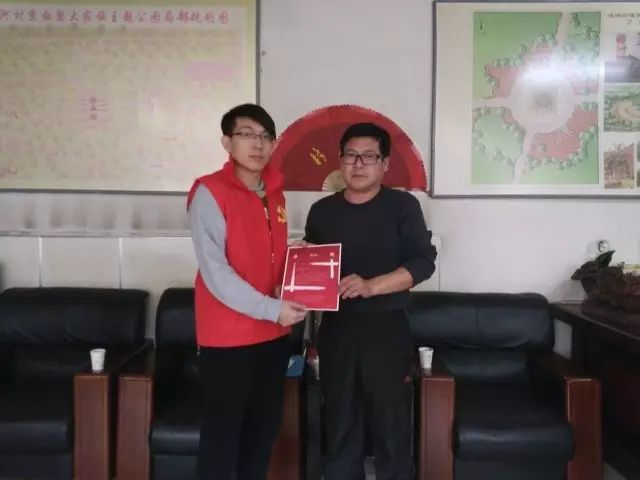 学生党建工作委员会向魏书记呈递决赛邀请函,并向村支部委员说明比赛举办时间、地点,确定届时村支部委员的出席嘉宾。之后,秘书处工作人员与魏书记共同为营销大赛荣誉证书盖章,商讨并确定了大赛最终的奖项设置与评审方式。