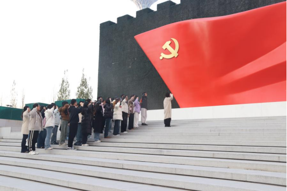 参观结束后,在党建实践中心主任孙艺甄的带领下,同学们于党史展览馆外整齐列队,面向党旗庄严宣誓,重温入党誓词。铿锵有力的誓言响彻党史展览馆上空,进一步坚定了学生党员的理想与信念。