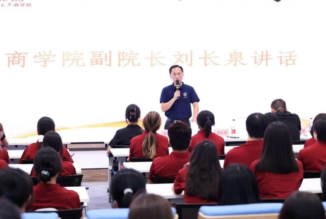 刘长泉结合自身求学与工作经历对新生步入大学,提出三点建议。一是清晰认知自我,强化对学院与专业的归属感;二是传承学院红色基因,树立集体荣誉感;三是作为一流商科学生,坚定责任担当。他鼓励新生在校园生活中加强自我管理,潜心学习、不惧困难,成长为有梦想、有价值、有信仰的人。