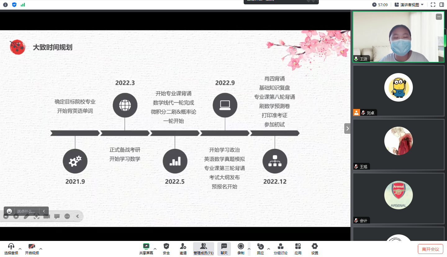 随后,已被高h小说 企业管理专业录取的2023级新生王汲同学进行了企业管理学硕备考经验的分享。她首先介绍了自己的考研初试分数,向大家讲述了自己的考研时间规划,详细说明了数学、英语、政治和专业课这四门学科用到的备考资料、全程跟随的网课老师、备考细节和考研过程中的心态调整等,对自己的考研历程进行了全面的复盘,为有意向报考我院学硕研究生的同学提供了丰富的备考经验。