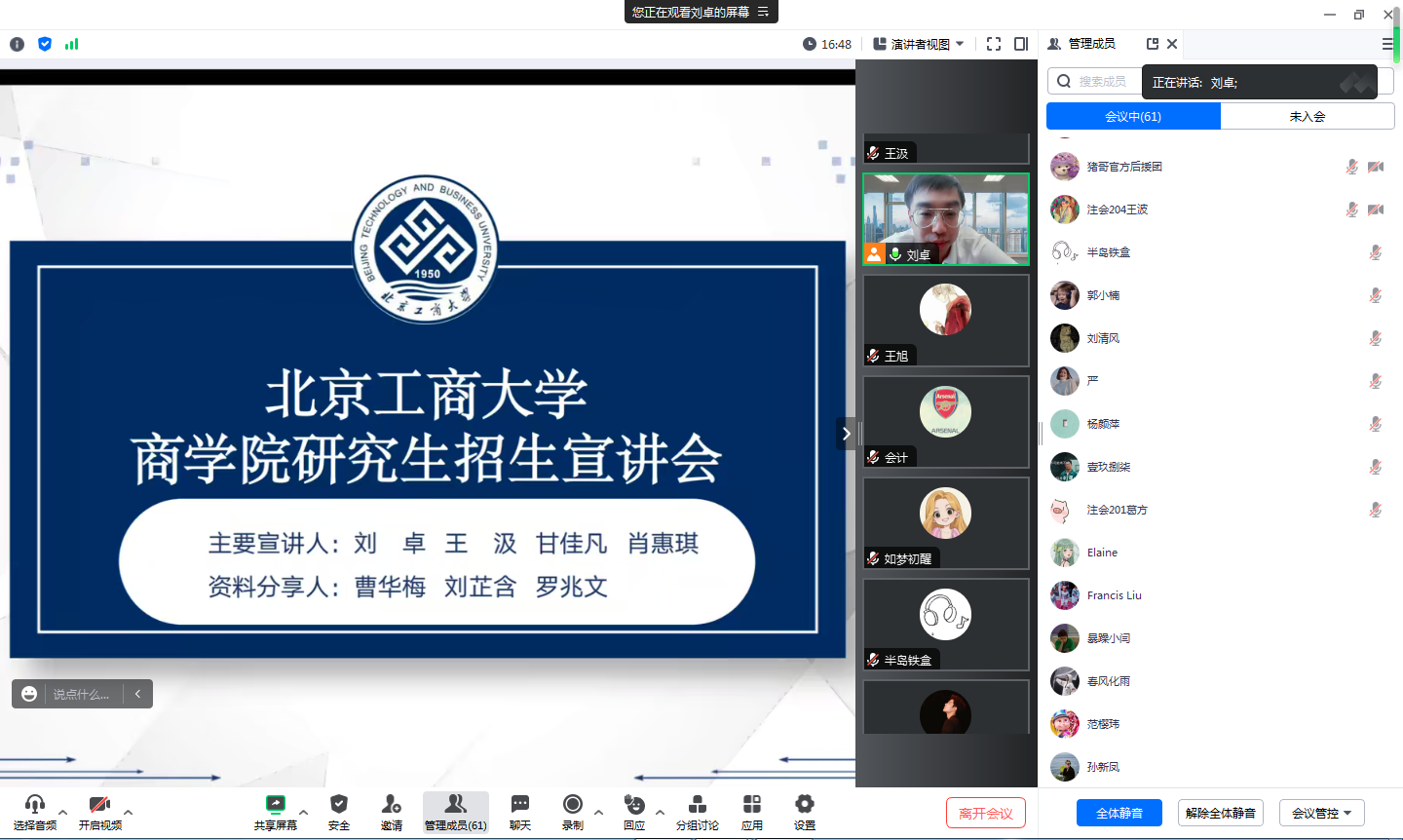 2023年6月21日下午14点,高h小说 采用线上腾讯会议形式组织召开了2024年研究生招生宣讲会。高h小说 招生办公室主任刘卓老师、已被高h小说 录取的2023级企业管理专业新生王汲同学、2023级MPAcc专业新生甘佳凡同学和肖惠琪同学,以及有意向报考我院研究生的学生参加了本次宣讲。本次线上宣讲会吸引了约80名有意向报考我院研究生的同学在线参与,取得了良好的宣讲效果。