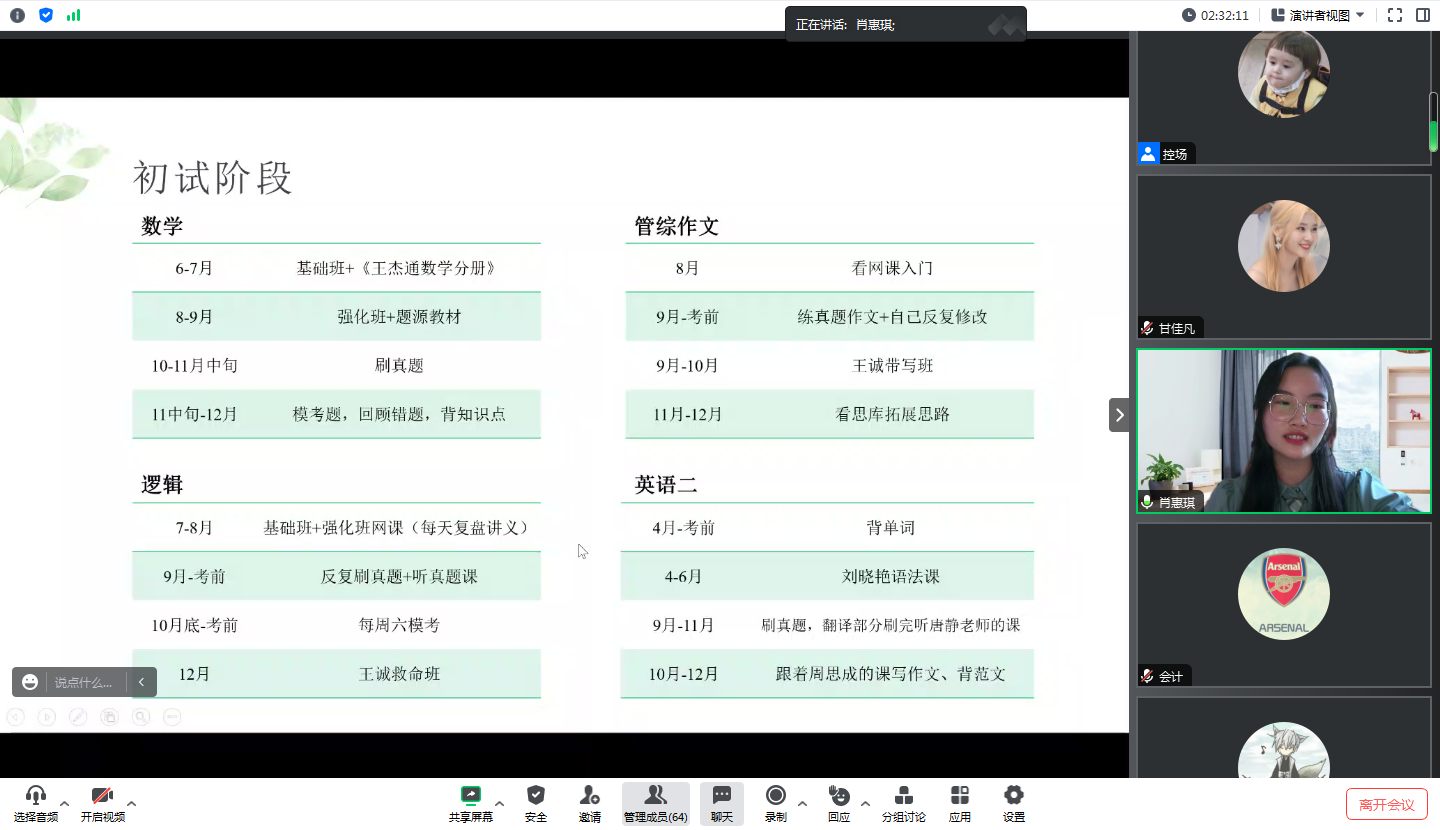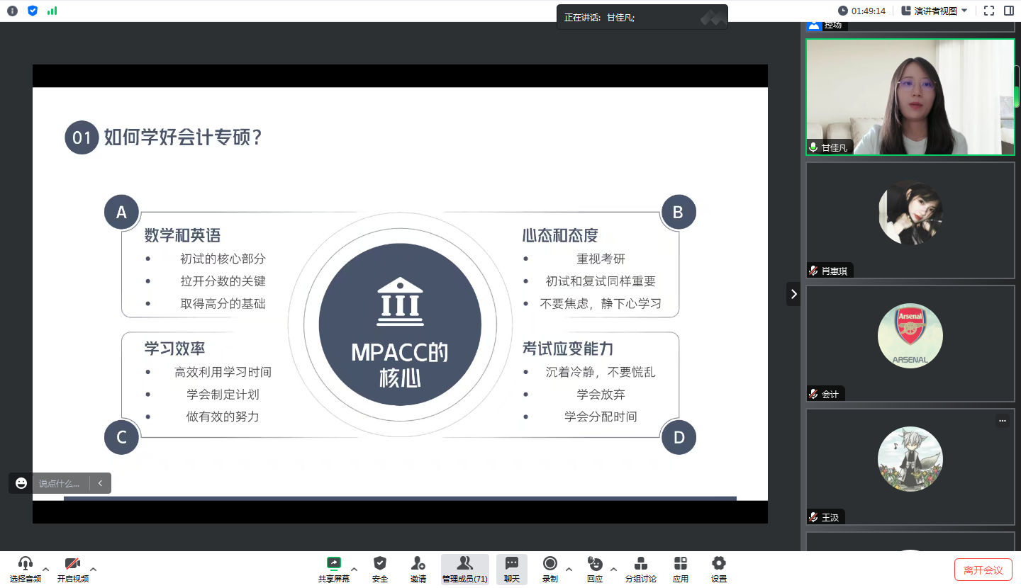 接着,已被高h小说 MPAcc专业录取的2023级新生甘佳凡同学和肖惠琪同学进行了MPAcc专业备考经验的分享。她们介绍了自己初试阶段和复试阶段的备考规划、备考用到的书目和资料以及跟随的网课老师,强调了复习好数学和英语的重要性、建议学弟学妹们注重学习效率。