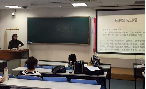 讲座伊始,唐孟娇学姐先针对当前的考研形式进行分析,再从自身谈起。她首先介绍了自己的英语学习技巧,接着说明了考研笔试和面试需要注意的种种细节,告诉大家要把握住机会,积极向导师展示自己。