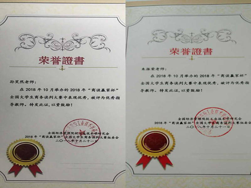 商务谈判队参加了在宁夏银川的北方民族大学举办的全国经济管理院校工业技术学研究会沟通与谈判委员会第六届学术年会暨2018年“商谈赢家杯”全国大学生商务谈判大赛。孙笑然老师作为指导老师带队参加。