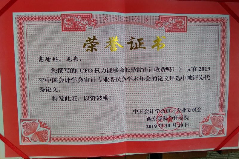 我院会计系教师高瑜彬与财务管理专业硕士研究生毛聚的合作论文《CFO权力能够降低异常审计收费吗?》入选本次年会宣讲,并经组委会推荐、专家投票,最终从24篇汇报论文中脱颖而出,被评选为2019年中国会计学会审计专业委员会学术年会优秀论文。