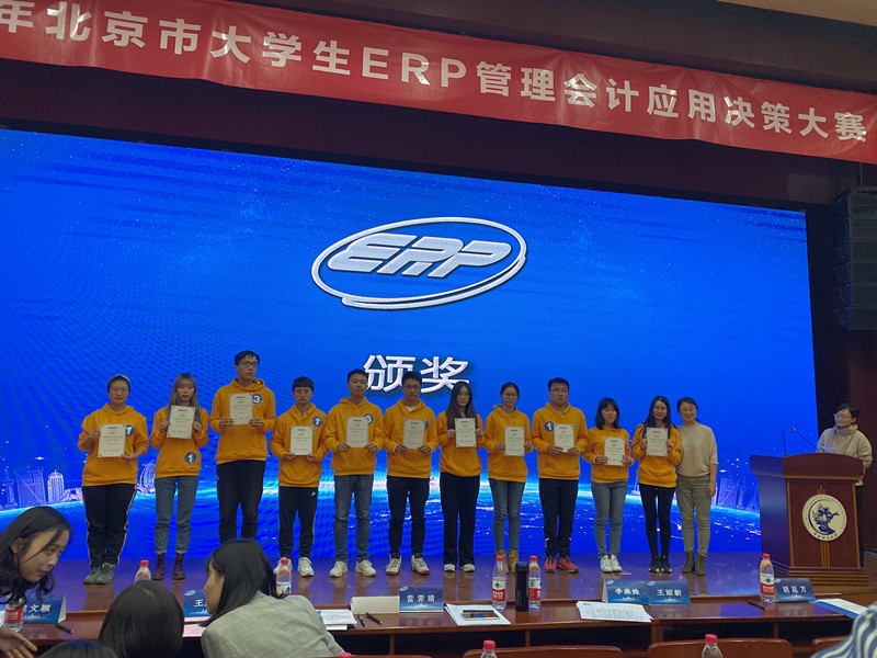 2019年北京市大学生ERP管理会计应用决策大赛由北京市教育委员会主办、中央财经大学承办,是北京市首个官方性质的经管类学科竞赛,共有来自北京市27所高校的691支队伍报名参赛,我校共有5支队伍进入总决赛。总决赛包括ERP管理会计决策应用和经营成果展示两个环节。在决策应用阶段,每支队伍的4名成员分饰不同角色,分工协作,分别完成年度目标制度分解、年度预算编制、一二季度预算执行、预算分析与调整、三四季度预算执行、预算考核等环节,将学到的管理会计、财务会计、管理学等知识综合运用到商业场景中,并根据商业环境随机应变,展现了过硬的专业素质。
