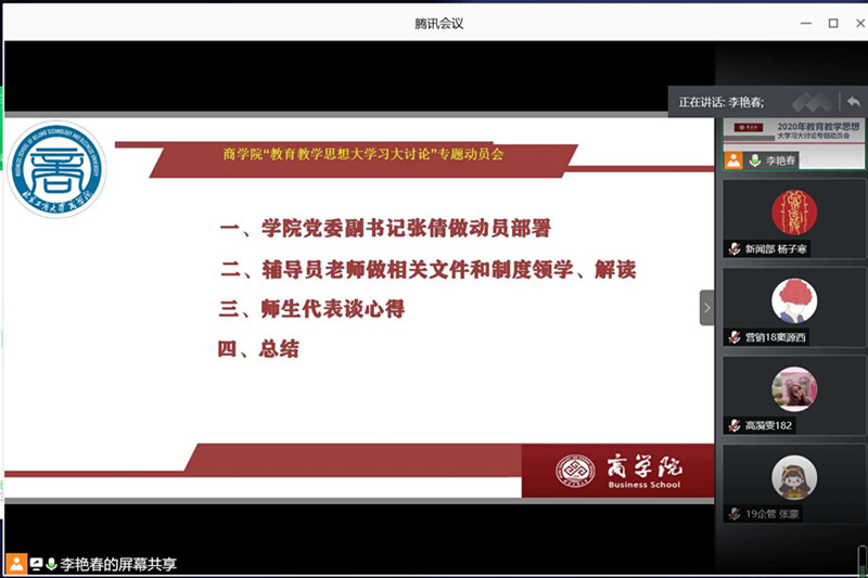 学院于8月17日和20日召开两场主题为“落实立德树人,培育一流人才 ”线上“教育教学思想大学习大讨论”专题动员会议,累计150余名师生参加动员会议。学院党委副书记张倩,全体辅导员、本研学生党支部书记、团学干部、各班骨干等参加此次会议。会议由团委书记李艳春主持。