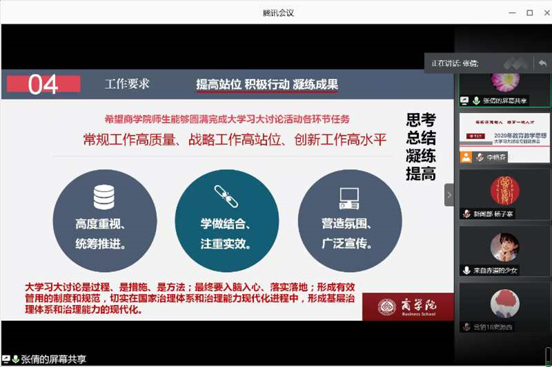 李艳春老师带大家领学了习近平总书记在纪念五四运动100周年大会上的讲话,并要求深入学习讲话精神,树立远大理想,坚定信念跟党走,发扬五四精神,绽放青春有所为。赵杰老师和寇明雯老师分别重点讲解了《研究生手册》和《学生手册》的规章制度,并要求各层组织要加强学风建设和诚信教育工作,营造积极向上的学习氛围,打造良好的育人环境,促进学生全面发展。辅导员郭建荣老师和李璐老师分别从学生能力的培养以及育人为本的角度出发,强调要抓落实,夯实党建基础,充分发挥“商梦花开”辅导班的优势,全面提升学院的学风建设。学生代表商研1832党支部王莉雅、本科生学生会主席工商181班谢皓尘和会计191班班长刘丁丁作为学生干部都进行了发言,表示要做好榜样示范作用,创建优秀基层组织。
