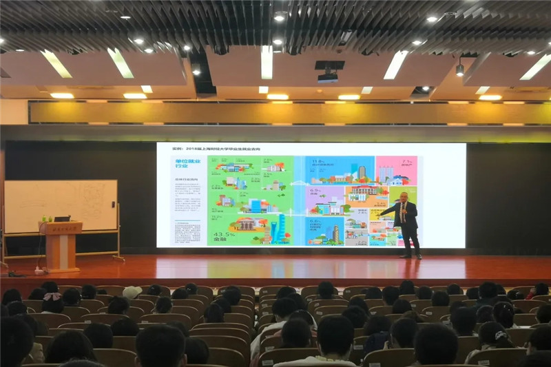 曲老师首先就商科生的职业未来发展,利用17、18、19年商科的人才需求数据进行了分析,以“过河模型”作为引子,与同学们开启了互动,吸引每一名同学的注意力,同时用鲁迅的作品名称形象地为同学们阐述了学习方向该如何选择的道理,为同学们选择就业层次做出了指引;通过讲解事务所培训和工资体系为同学们进行职业发展规划;他语重心长地告诉同学们应该合理安排大学时光,积累资历,丰富简历,不仅要学好专业知识,更要综合提升自己的实力,做复合型人才。