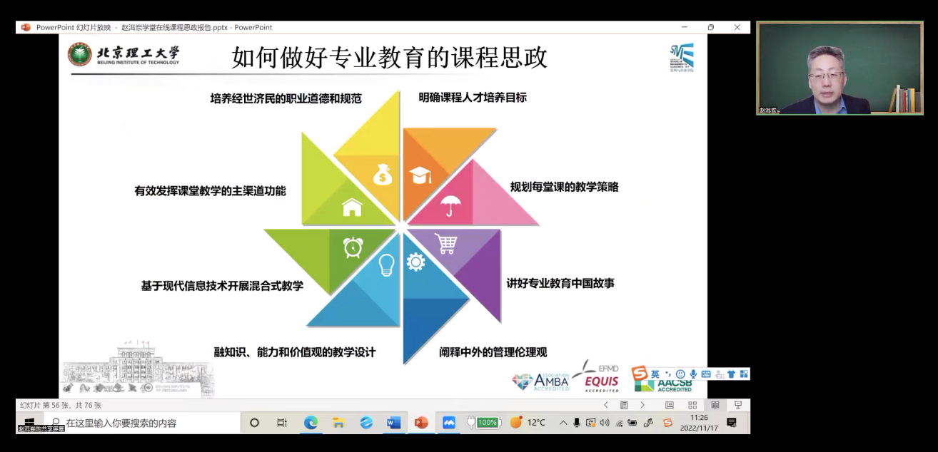 主讲人赵洱岽教授基于国家政策和教学现状的背景,阐述了课程思政建设和数字化教学改革的重要性。围绕教师教学理念和教学设计方法,讲解新时代课程思政路径的道术相济。从学术化的教学导向、信息化的教学手段、系统化的教学方式全方位讲解“一核三维”的立体化学习范式。同时根据沟通系列典型课程思政案例,解析教学“前、中、后”期的不同策略。并强调要因材施教、以学为本,将课程思政元素融入课堂,从而建构由教到育的立体化人才培养模式。