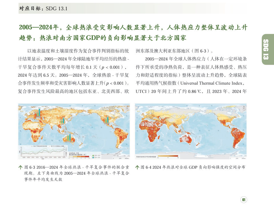 研究结果表明:2005—2024年,全球热浪受灾影响人数显著上升,人体热应力整体呈波动上升趋势;全球热浪强度指数每升高1个单位,GDP增长率显著下降0.08个百分点(p <0.01)。热浪事件对南方国家(中低收入国家,尤其是热带/亚热带发展中国家)GDP的负面影响平均达北方国家(高收入国家,尤其是温带发达国家)的2.5倍(图6-4)。2024年,热浪对全球GDP的间接影响(占比62%)主要通过破坏生态系统的供给服务(如生产原料、水供给,占比35%)和调节服务(如气候、水文调节,占比27%)传递,进而冲击供应链和资源价格等,最终拖累GDP增长,其影响显著大于直接热冲击(占比38%)。
