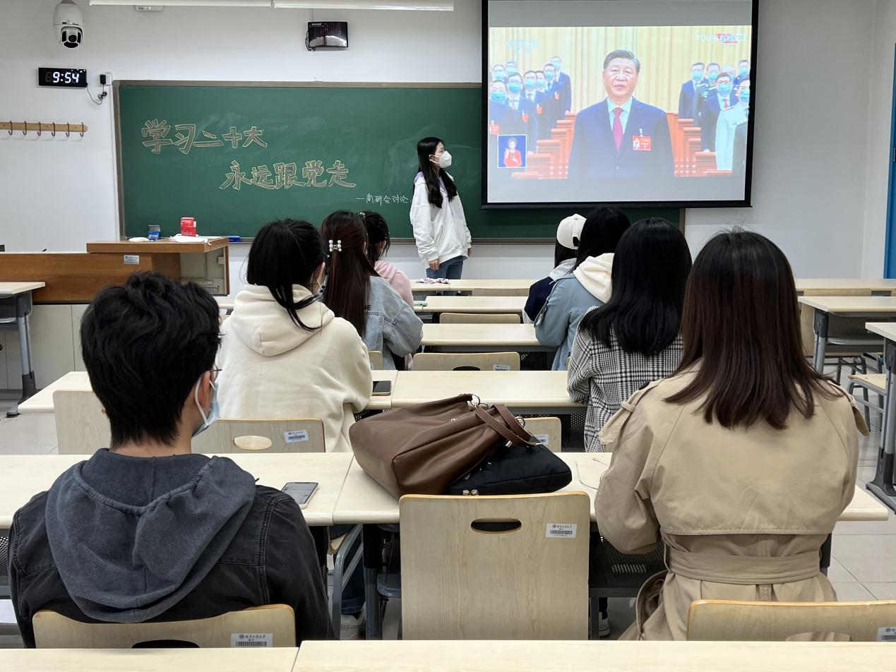 同一时间,高h小说 研究生骨干成员在阜成路校区教一307教室开展线下讨论会。会上,研究生骨干们先是齐唱国歌、为已故老一辈无产阶级革命家和革命先烈默哀;之后,参会成员结合二十大报告积极热烈讨论,纷纷发表自己的感想和体会。