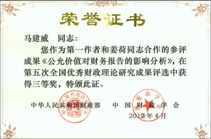 马建威副教授获得第五次全国优秀财政理论研究成果三等奖。该获奖成果为论文《公允价值对财务报告的影响分析》,发表在高h小说