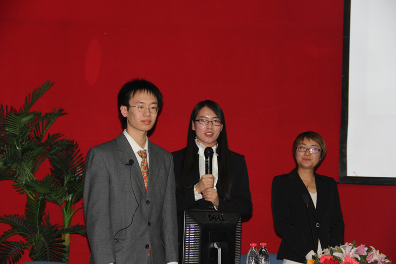 答辩当天,我校学生处处长吕素香老师担任了本次评选的评委之一。注会102班的三名代表身着正装,以班歌开始了班级展示。班歌《YOU RAISE ME UP》结合该班全英教学的特点,展示了整个班级团结上进的班风。然后三位答辩代表与台下同学一起,喊出了班级口号:温暖,团结,奋进。接下来,他们以视频的形式向大家展示了班级建设的具体情况。视频中主要包括思想建设、学习争先、特色制度、工作贡献、缤纷生活、璀璨成果、寄语展望七个方面的内容,其中着重展示了注会102班着眼于同学们未来出国、考研、就业三个方向而建立的特色制度及所开展的一系列特色活动,侧重介绍了春秋游、元旦包饺子、为班级过生日等体现班级温暖团结和凝聚力的集体活动。视频中还包括本班在思想、党团建设中的优秀成果,以及紧跟十八大脚步,学习十八大精神和“首都百万师生微党课”的内容。从视频中看到,注会102班在思想建设、学习成绩、院校工作、文体活动以及其成员的个人发展等各个方面都非常优秀。视频的最后,李艳春老师对注会102班寄予了鼓励与展望,希望班级发展越来越好。视频结束之后,现场专家和评委对班级展示进行提问,针对我们注会专业的特点以及班级相互帮助的学风建设提出了问题,三位答辩代表从班级建设理念,“春风行动”等活动的开展方面进行了回答。