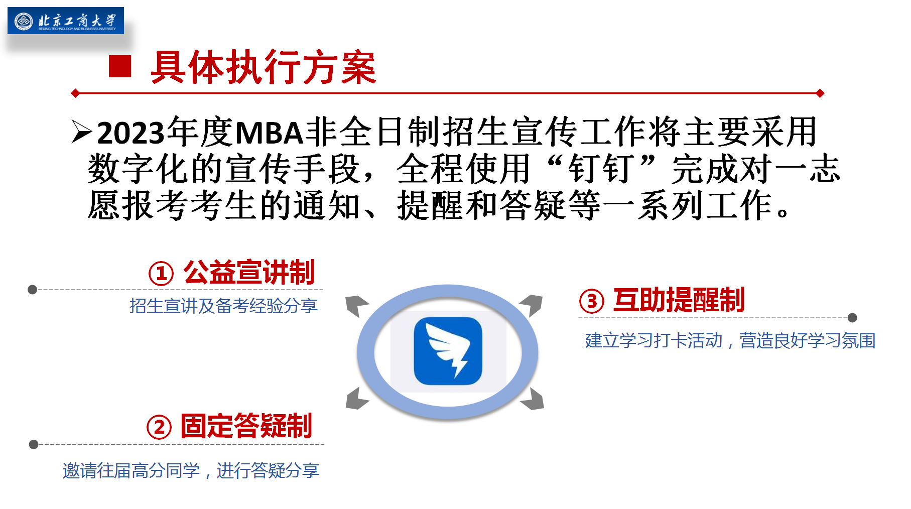 宣讲会第一部分由孙永波老师介绍招生宣传方案。他表示在疫情与数字化背景下,本次MBA招生工作全程使用“钉钉”进行通知、答疑、经验分享和日常打卡活动。希望通过建立往届高分考生答疑制度,每日互动打卡提醒等方式,营造浓厚积极的学习氛围,帮助考生全面了解高h小说 MBA项目。