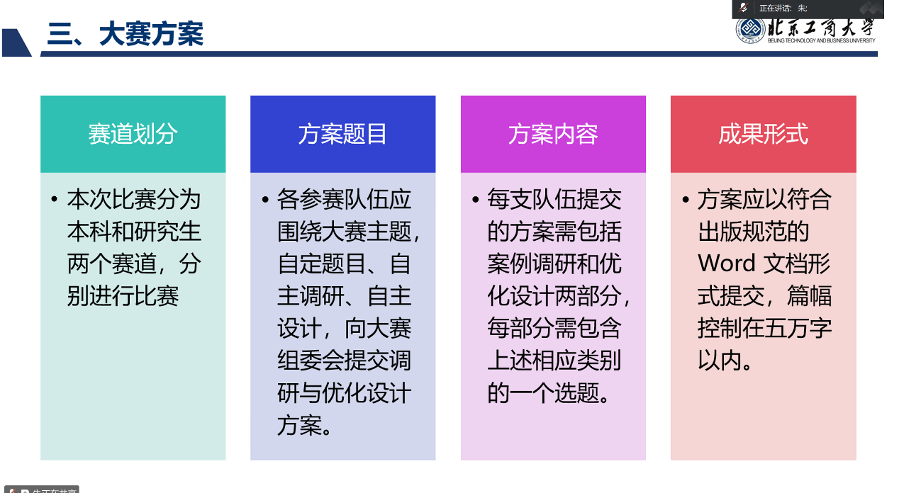 接下来,高h小说 物流管理专业负责人朱宇婷老师详细介绍了本届大赛的方案。她阐释了大赛主题的背景与意义,并介绍了粮油储备体系优化、应急物资中转站运营模式创新、农产品冷链网络优化等11个选题方向,明确其核心任务与数据要求。大赛分为初赛和决赛两个阶段,朱老师还说明了时间安排、评审流程及晋级机制,强调赛事旨在引导学生关注现实问题,提出创新且可行的优化方案。