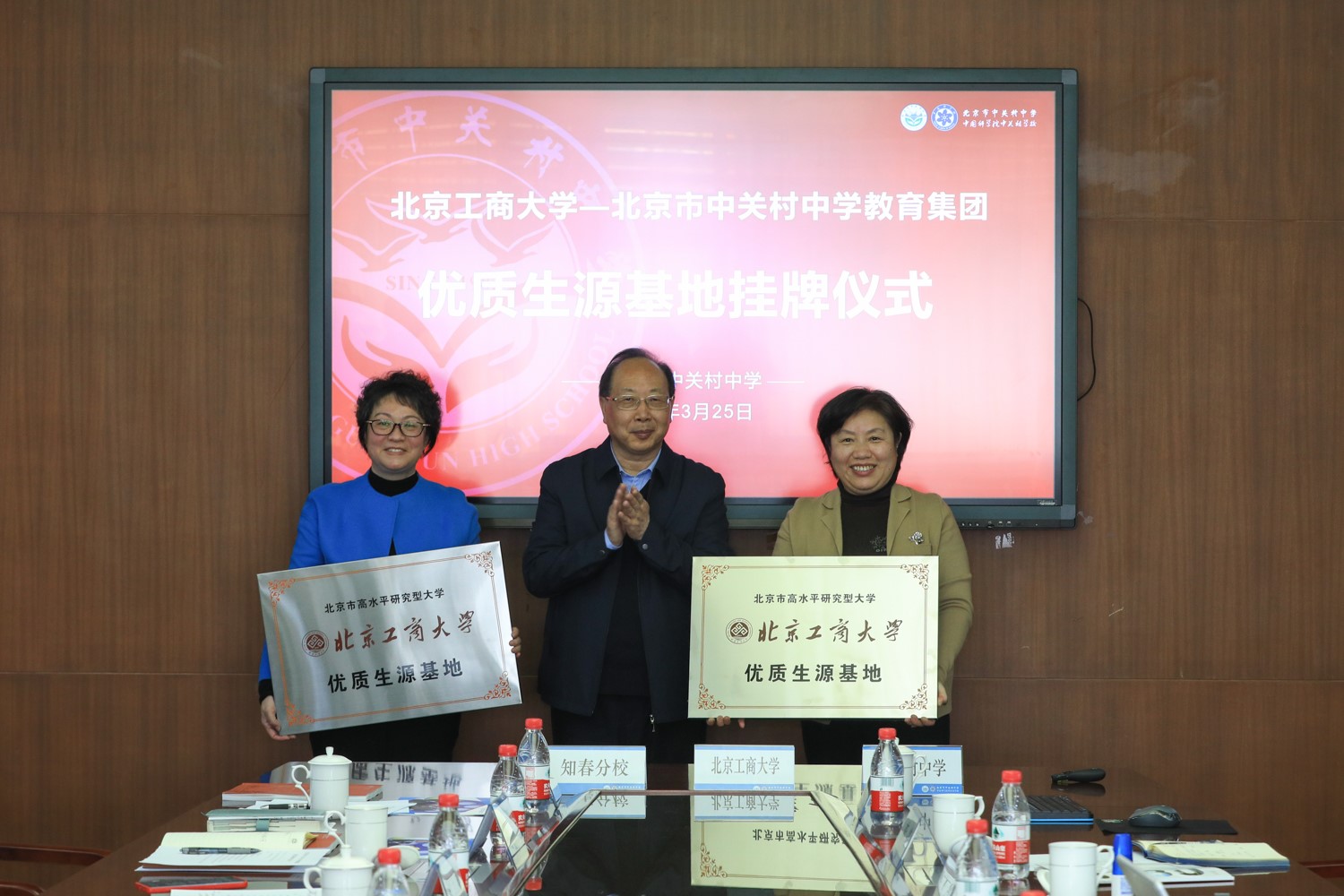 随后,我校与中关村中学及知春分校分别签署《优质生源基地合作协议》,并举行了“优质生源基地”授牌仪式。
