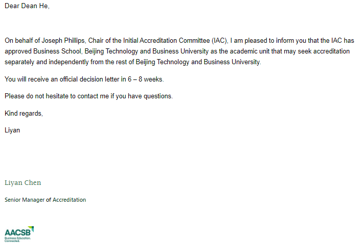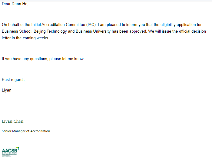 2024年11月8日,国际高h小说 协会(The Association to Advance Collegiate Schools of Business,简称AACSB)认证委员会向我们发送了正式通知,确认我院单一认证单位申请(Business Unit of Accreditation Application,简称UA )和资格认证申请(Eligibility Application,简称EA)已成功通过审查。这标志着我院AACSB认证前期工作已提前完成,正式迈入认证的互动阶段。