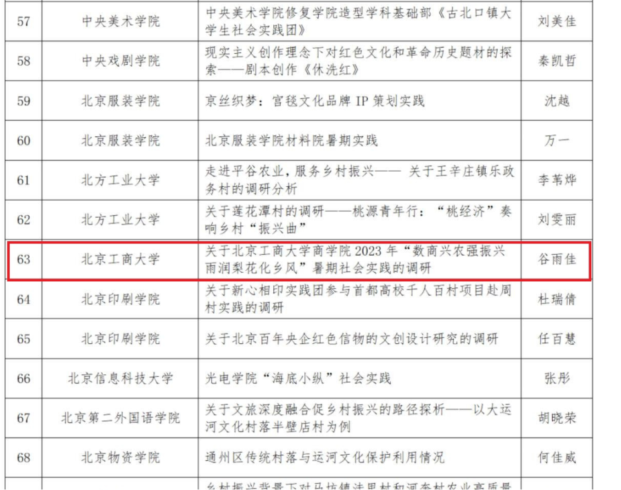 我校该获奖项目自立项起,按照项目计划认真执行,线上线下相结合广泛开展社会调研和实践。以具备多年合作基础的北京市房山区琉璃河镇贾河村为实践目的地,围绕“产业振兴、数商兴农”“文化振兴、文明乡风”两条主线,致力于通过实地调研、电商营销、人员培训、采摘节筹办、营造梨花节热点、设立社会实践基地、拍摄贾河村京白梨宣传片、设计文创产品等多环节积极开展专题社会实践,为传统白梨销售打开新思路,为梨文化传播带来新气象,在助力京郊农村发展建设的同时致力于实现学生成长发展、商科人才培养多赢的格局。该项目在实践过程中,展现出我校师生心系家国、服务首都、立足实践、贡献才智的良好风貌。另悉,该项目在2023年首都高校师生服务乡村振兴行动计划中荣获优秀奖。