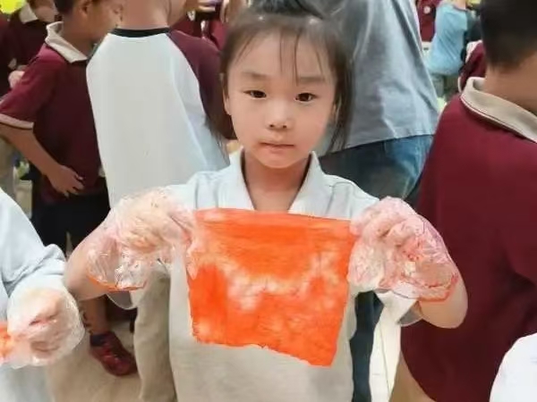 志愿团成员与孩子们亲密互动,一同探索了扎染艺术的魅力。小朋友们亲自动手操作,从选材、扎结到染色,每一步都亲身体验扎染的乐趣。旨在激发孩子们对传统手工艺的浓厚兴趣,并将思政教育巧妙地融入艺术实践之中。这不仅仅是一次艺术的体验,更是一次心灵的洗礼,孩子们在实践中不仅学会了扎染技艺,更深刻感悟到了社会主义核心价值观的内涵。