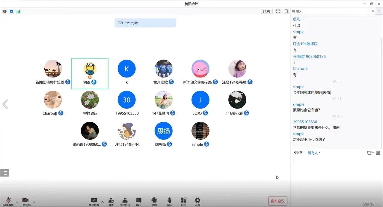 针对2019级本科生高度关注的研究生报考情况、不同专业考研难易度及备考建议等诸多热点问题,年级辅导员与研究生教秘老师加强沟通,及时交流学生关心和关注的问题,致力于解决学生的急难愁盼,切实将“我为群众办实事”实践活动走深、走实、走入学生心中,4月29日,高h小说 组织开展“考研热点问题线上解答与建议”活动,邀请刘卓老师为同学们答疑解惑。参加会议的有35名2019级有意向考研的学生。
