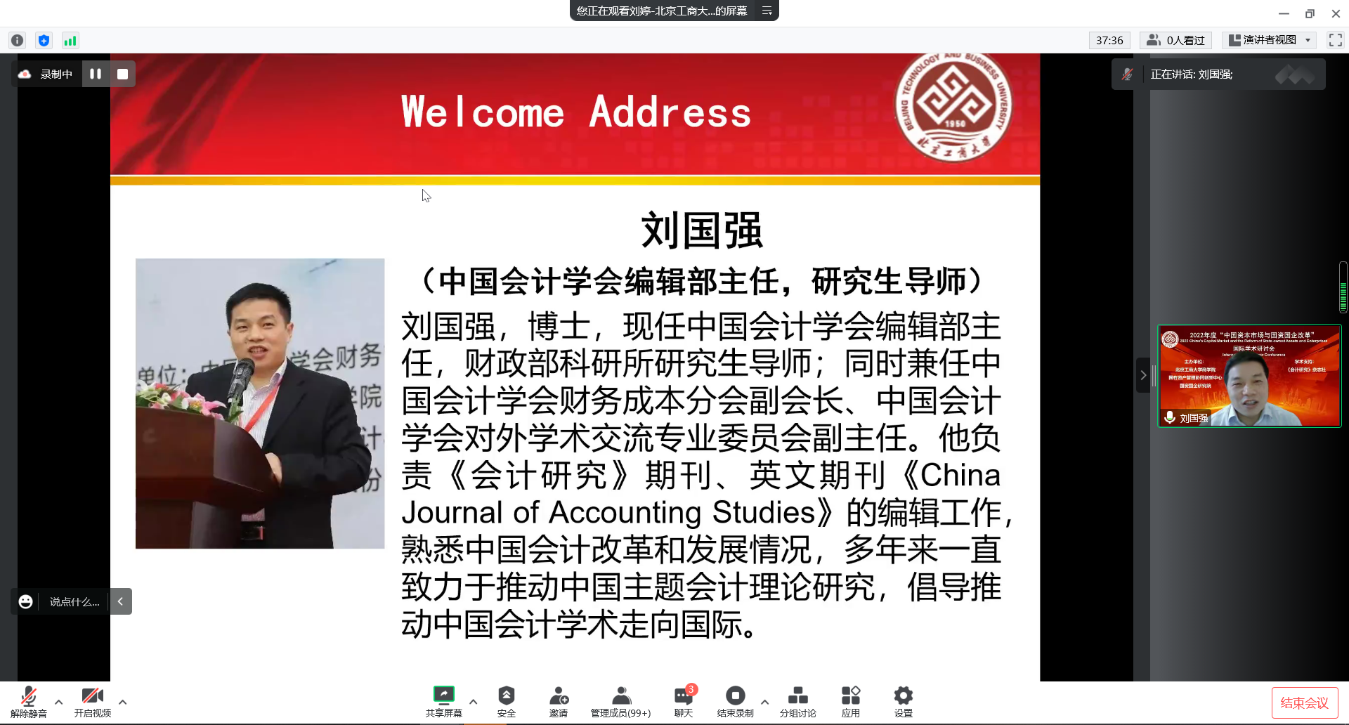 在开幕式上,龚六堂副校长和中国会计学会刘国强主任分别致辞。龚六堂副校长对与会专家、教师和学生表示热烈欢迎,他指出,在中国实现高质量发展中,要始终坚持两个不动摇,更好发挥资本市场和国有企业在经济发展中的重要作用。刘国强主任对会议的召开表示热烈祝贺!他表示,中国会计学会将一如既往地大力支持学校会计学科的发展,《会计研究》将在推动原创思想发表,会计在经济社会发展中作用,会计与业务、技术的深度融合等方面的研究上发挥更好的引领作用。