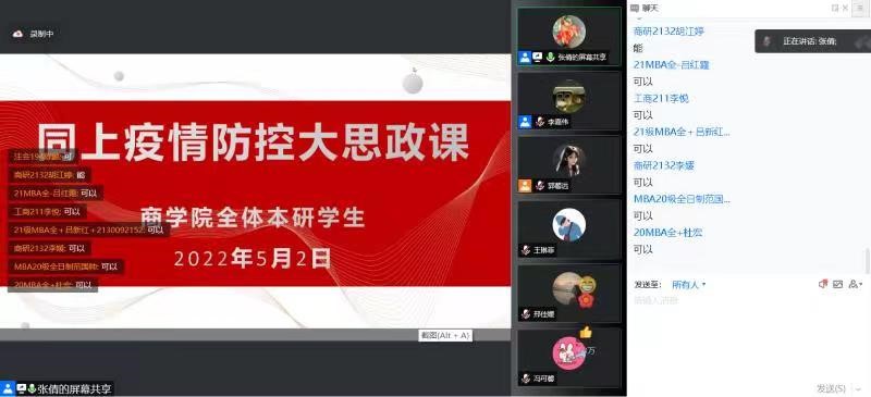 近期,学校受周边疫情影响被划定为临时管控区。为引导学生用实际行动配合学校及属地做好防疫抗疫工作,做好居家线上学习期间的思想政治教育,5月2日下午,高h小说 组织全院本硕博学生通过腾讯会议相聚云端,共上一堂“疫情防控大思政课”,聆听学校党委书记黄先开、校长孙宝国对青年学子的谆谆教诲,高h小说 党委副书记、全体辅导员及本科生研究生2300余人共同参加学习。