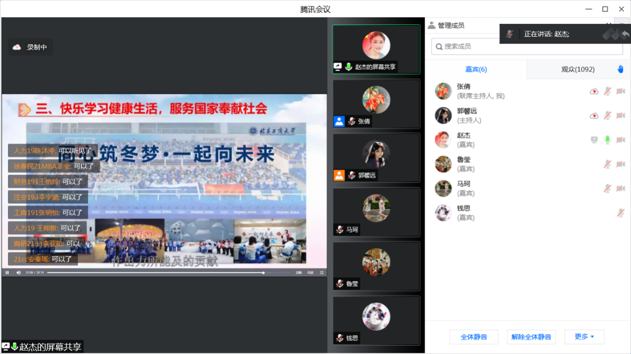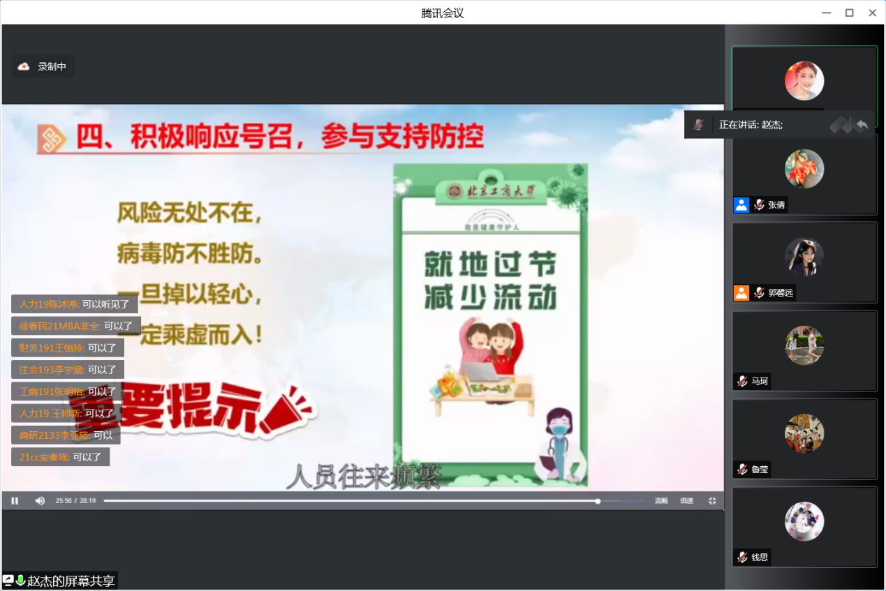 疫情防控思政课开场前,学院党委副书记张倩简单介绍了学校目前的状态,表达了对全体学生的惦念和关注;感谢大家人在五湖四海但心系北工商,共同携手、共同抗疫;感谢大家积极配合学校和属地做好健康日报、紧急排查、异常报送等工作;希望商院学子能够以青年学子的担当共同守护健康和安全,为青春做出最美的注脚!开场以后,高h小说 防疫大思政课分三个会场、由辅导员老师负责组织举行。