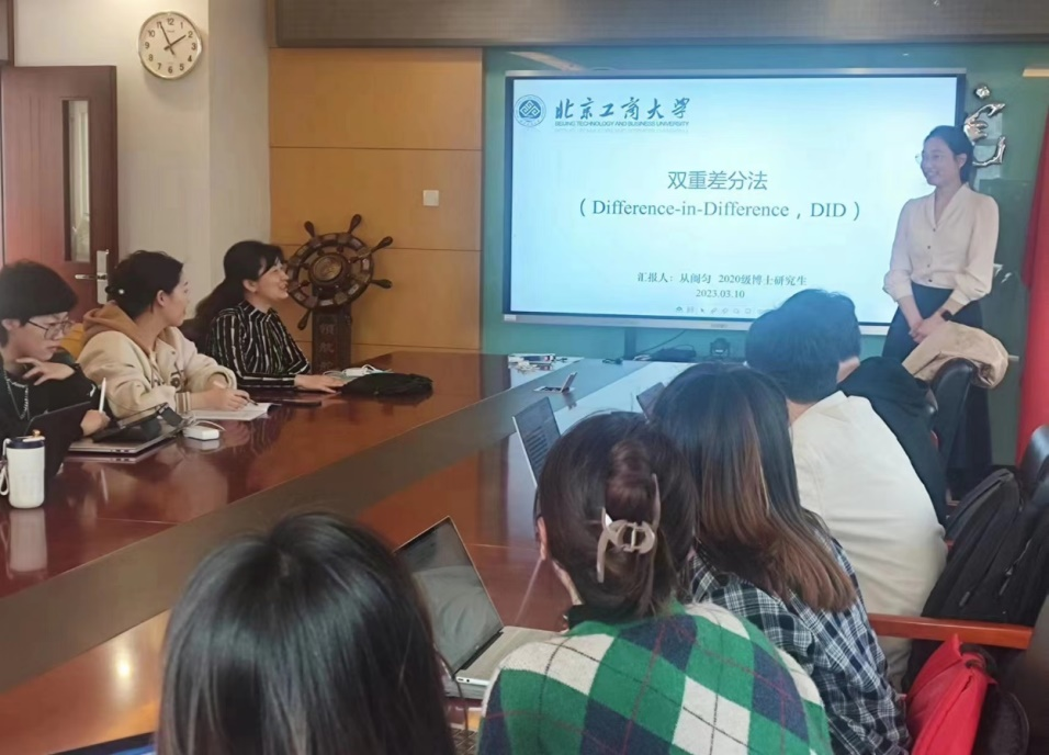 论坛伊始,从阓匀博士生就双重差分法和倾向得分匹配法的适用背景、计量原理、研究应用领域给大家做了详细讲解,并结合自己最新的论文发表成果及体会向大家讲解方法的具体使用以及容易出现的误区等。她也向大家展示了相关计量模型的操作方法、结果及解释,并表示这些研究方法需要大家反复学习、反复练习,这样每次都会有新的收获与心得。