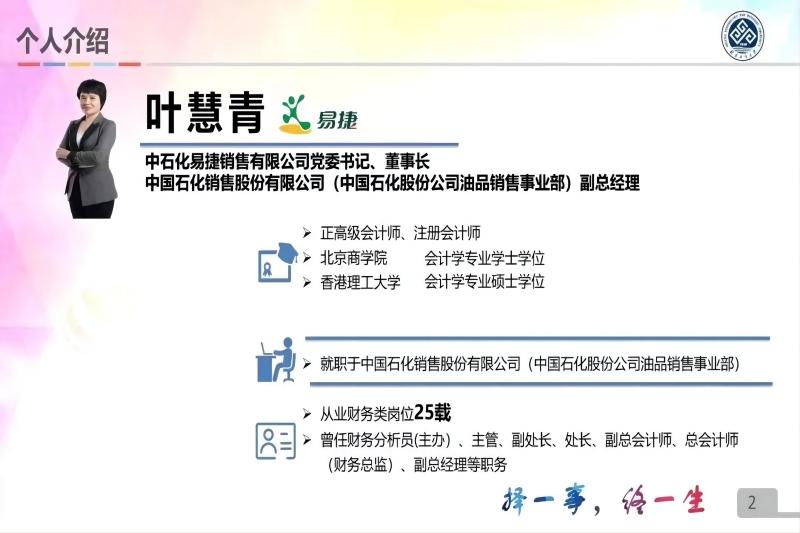 中石化易捷销售有限公司党委书记、中石化易捷销售有限公司董事长、中国石化销售股份有限公司(中国石化股份公司油品销售事业部)副总经理叶慧青女士首先从成长历程与公司业务等方面向同学们系统地介绍了中石化与易捷,使同学们对其有了一个整体认知。然后,叶女士从财务转型的视角,结合现代企业财务管理发展趋势,提出了现代财会工作更需要复合型全面发展人才。叶女士指出,财会工作者不仅要熟练掌握财会理论与实务操作,更需要具备多领域跨专业的知识体系,同时拥有大数据+财务思维与国际化视野和跨文化工作能力等。结合现代社会对财会人才的需求,同学们更加明确了未来的努力方向,为走出校园加强自身知识储备。最后,叶女士结合自身的求职与任职经历,对财务管理和会计学的同学们的职业生涯规划发展提出了中肯、实用的建议:善规划、永学习、崇实干、肯坚持与能利地,同时叶女士也表达了自己对同学们的要求和期望。